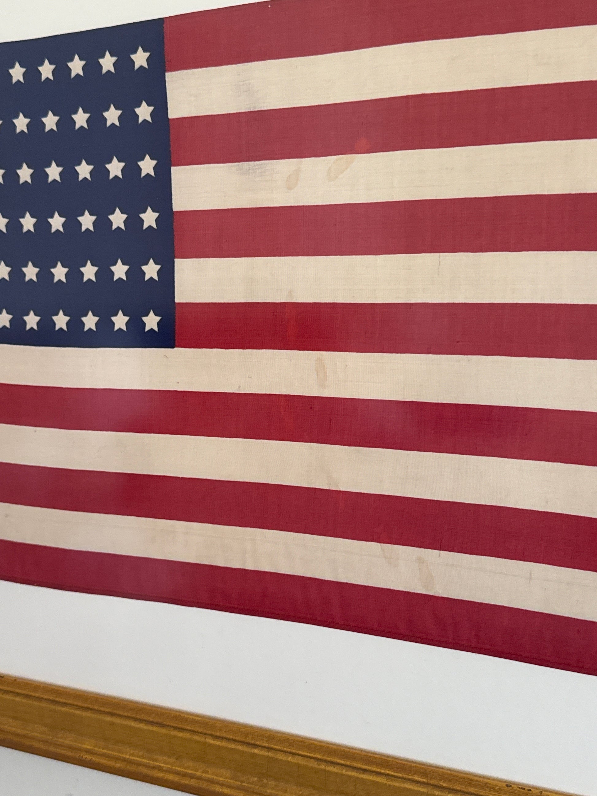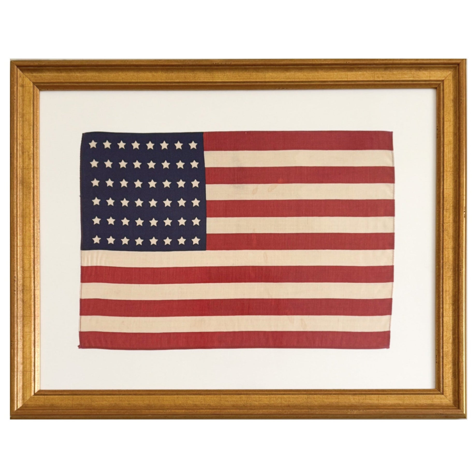 Measures 19 x 25 inches including the frame. An antique 48-star American flag made of silk. Light staining. UV protective reduced glare glass and a classic gold frame.