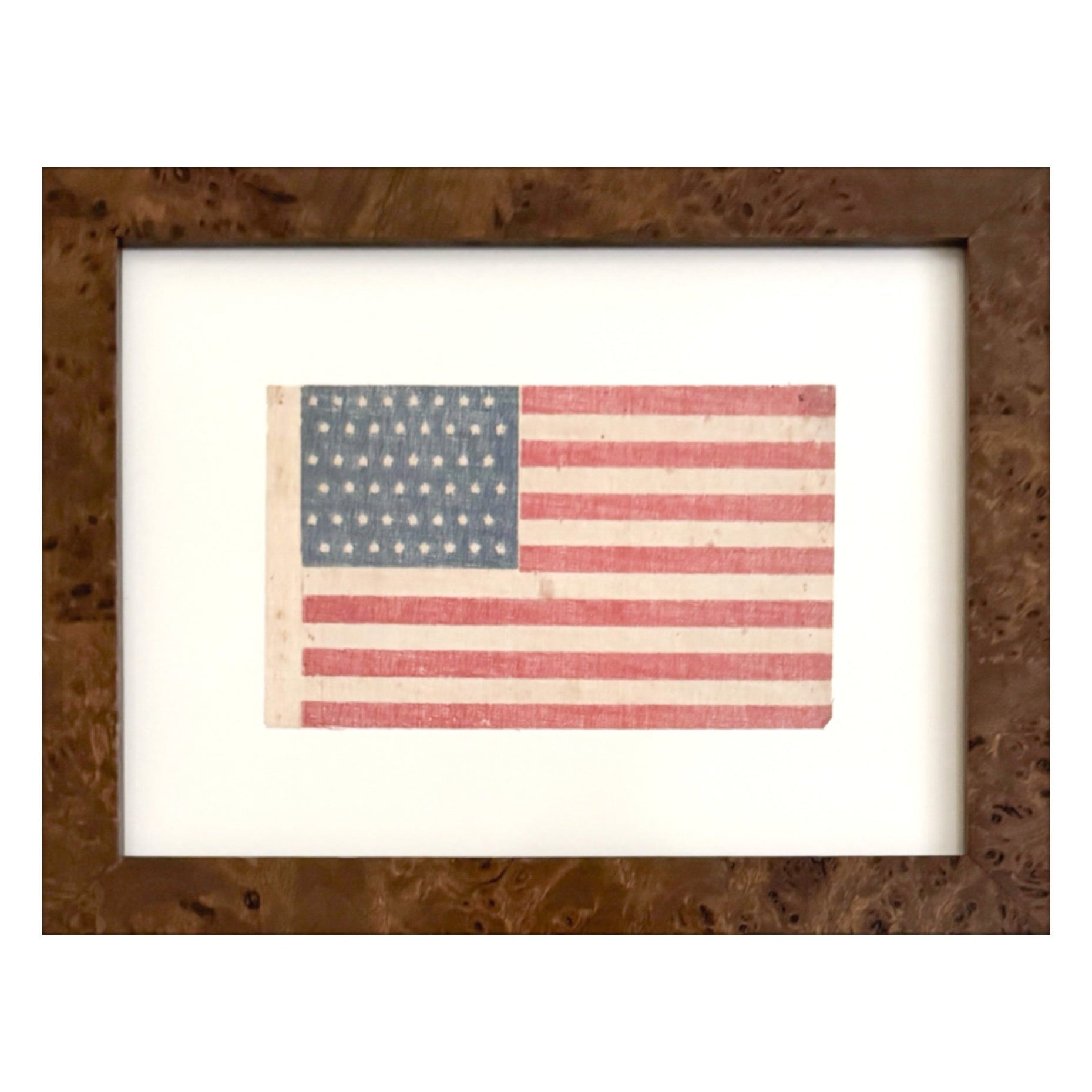 A vintage American flag parade flag. Burl wood frame. Measures 10 x 14 inches including the frame.