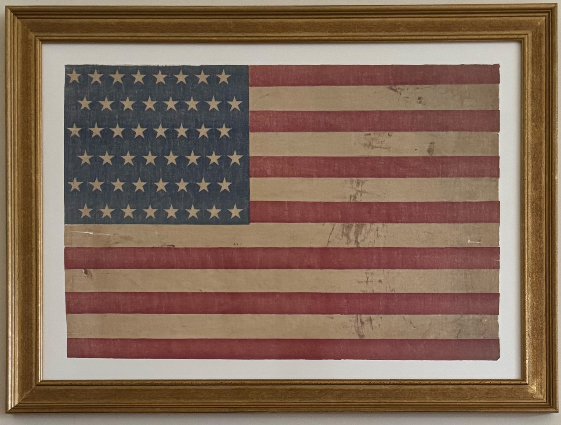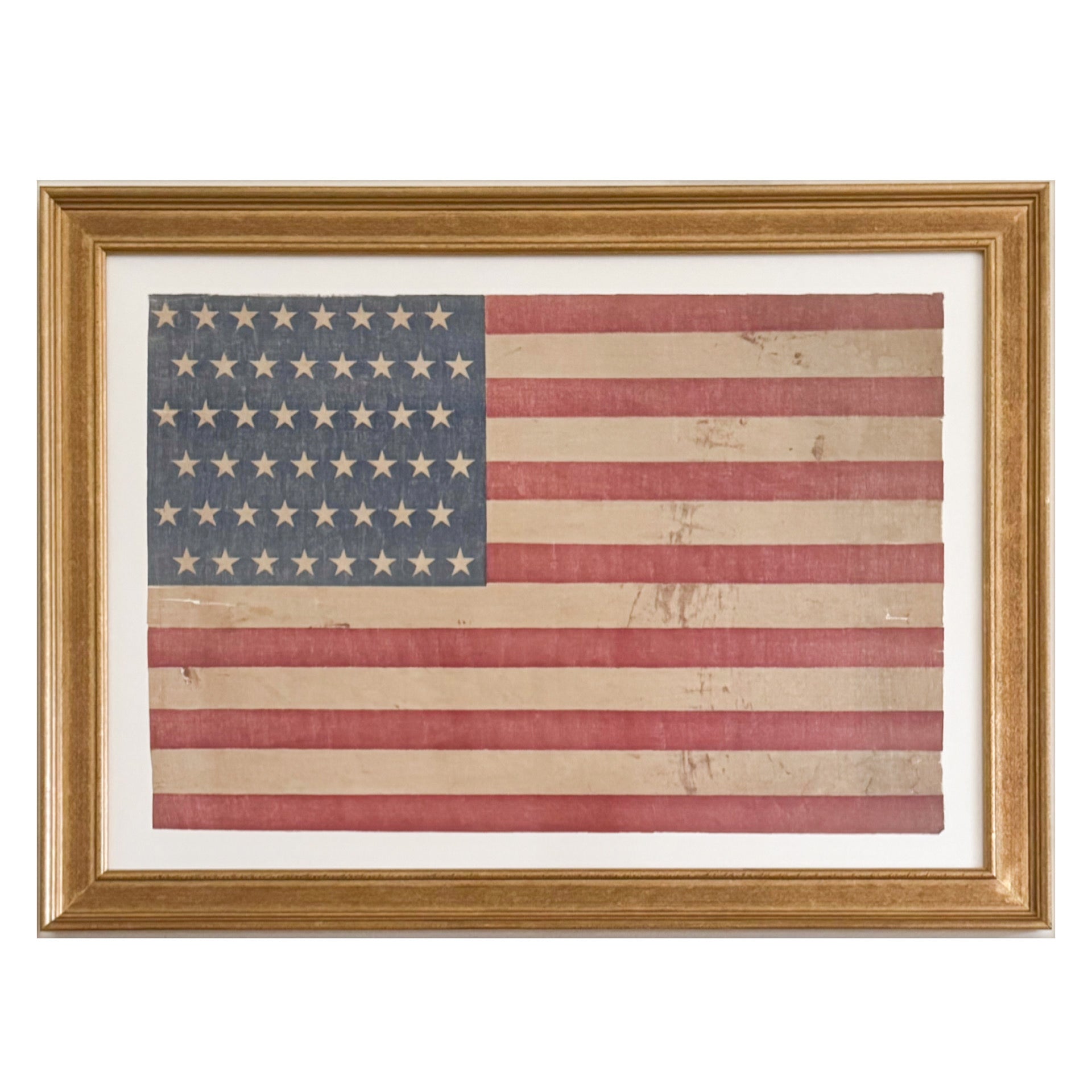 A large antique American flag from the 1920s with 48 stars. Made of linen. Tattered and worn. Preserved under UV protective, reduced-glare glass and acid-free matting. Measures 24 x 32 inches including the frame.