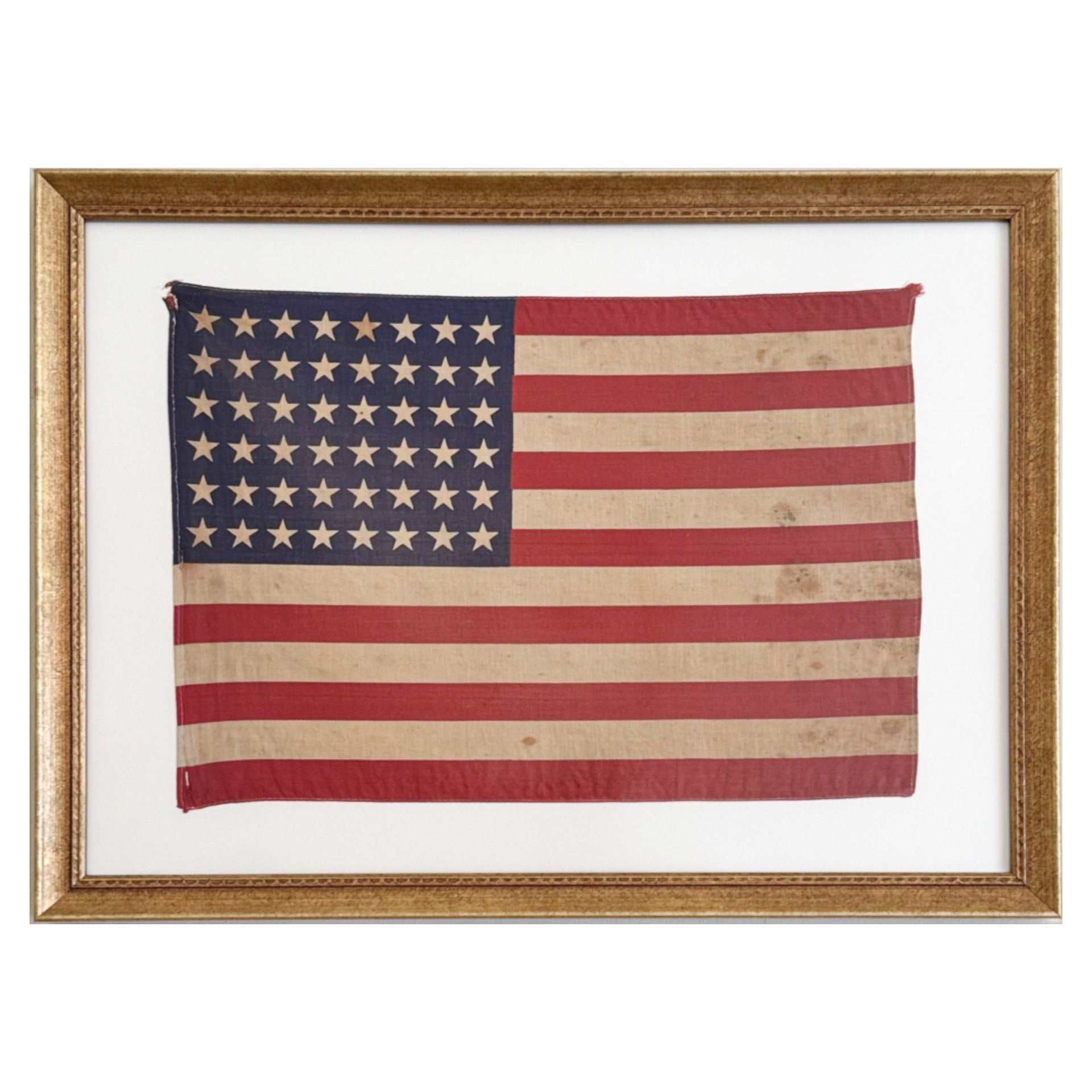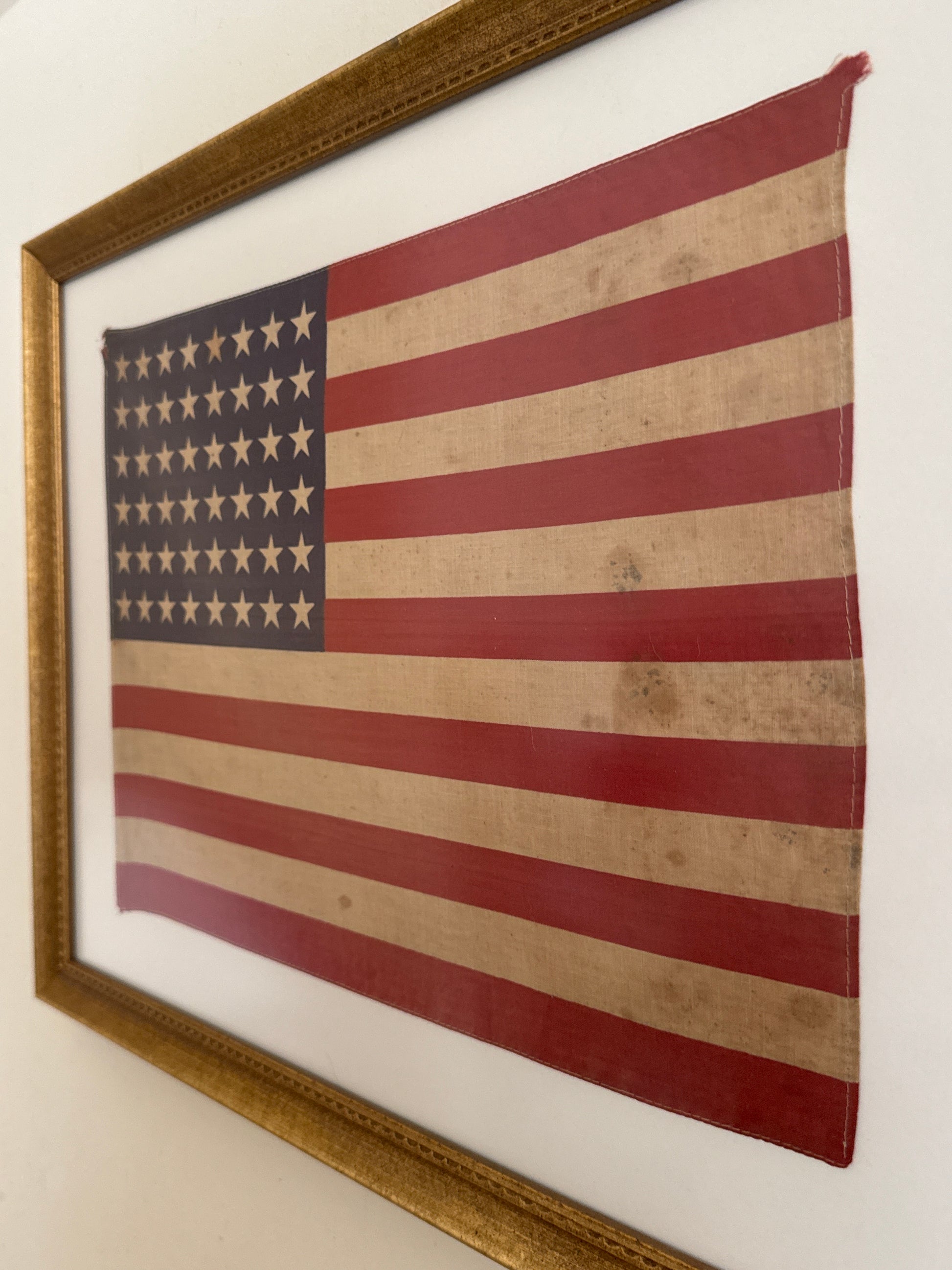 An antique 48-star linen flag. Tattered and stained. Dates to the 1930s. Acid-free matting and UV protective reduced glare glass. Measures 16.5 x 22.5 inches including the frame.
