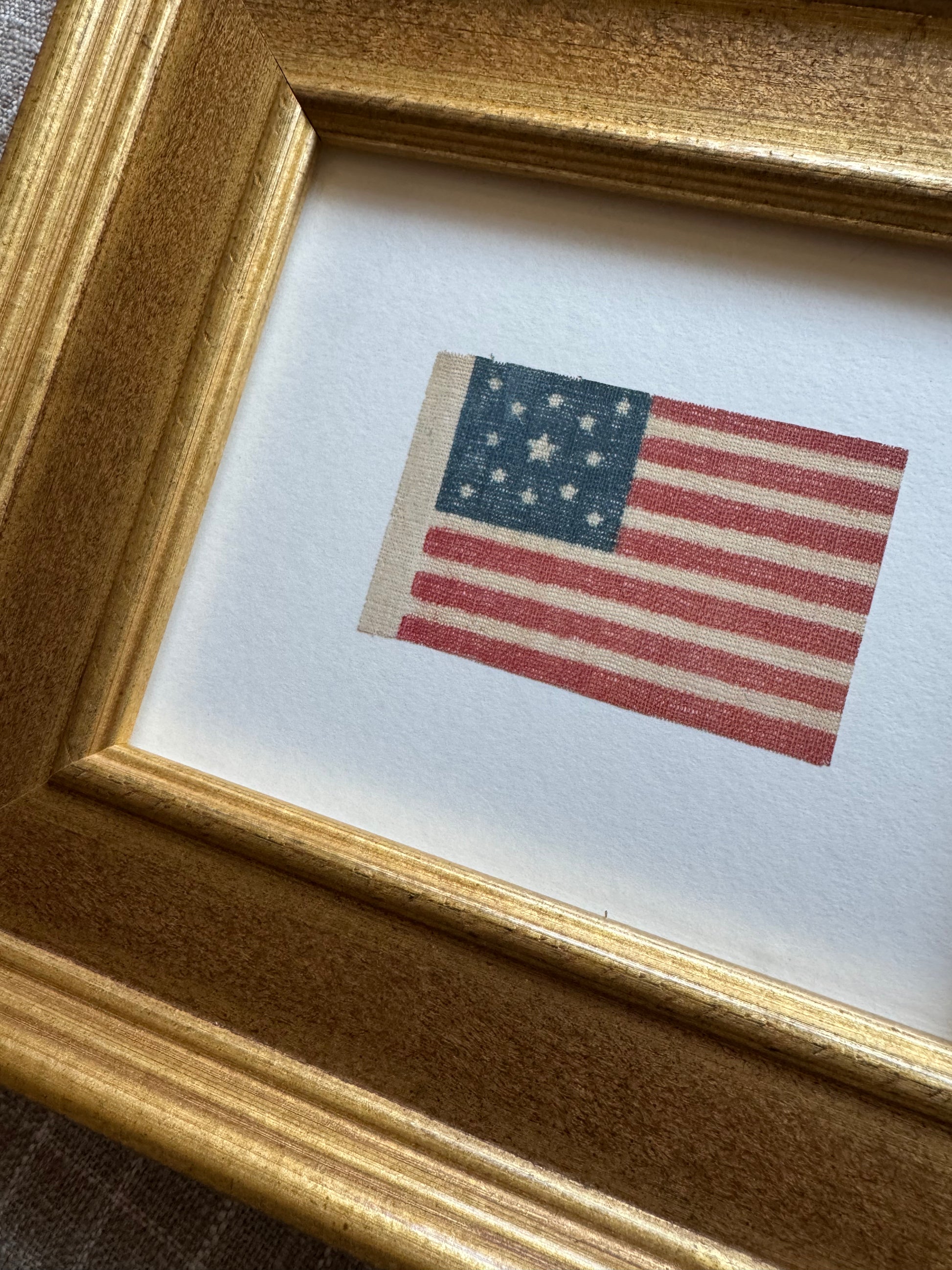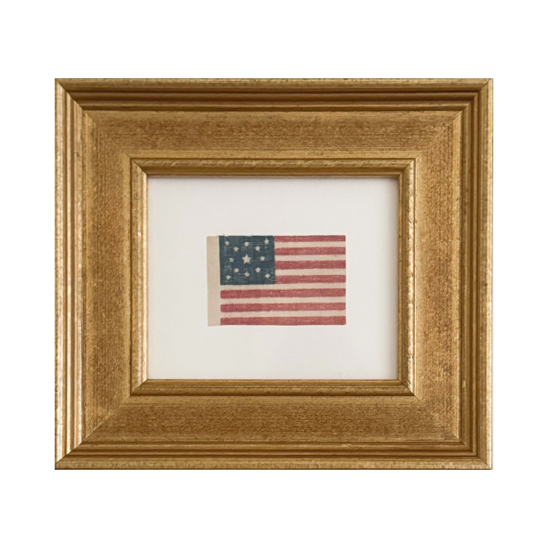 Measures 8.5 x 9.5 inches including the frame. An antique 13 star parade flag made of muslin. Represents the thirteen original colonies. This pattern is very rare and referred to as the “centennial medallion.” Lightly frayed and stained. Dates to the late 1800s, likely presented on a wooden stick at the time of use for the centennial of 1876. Preserved under UV protective, reduced glare glass with a narrow ornate gold frame.