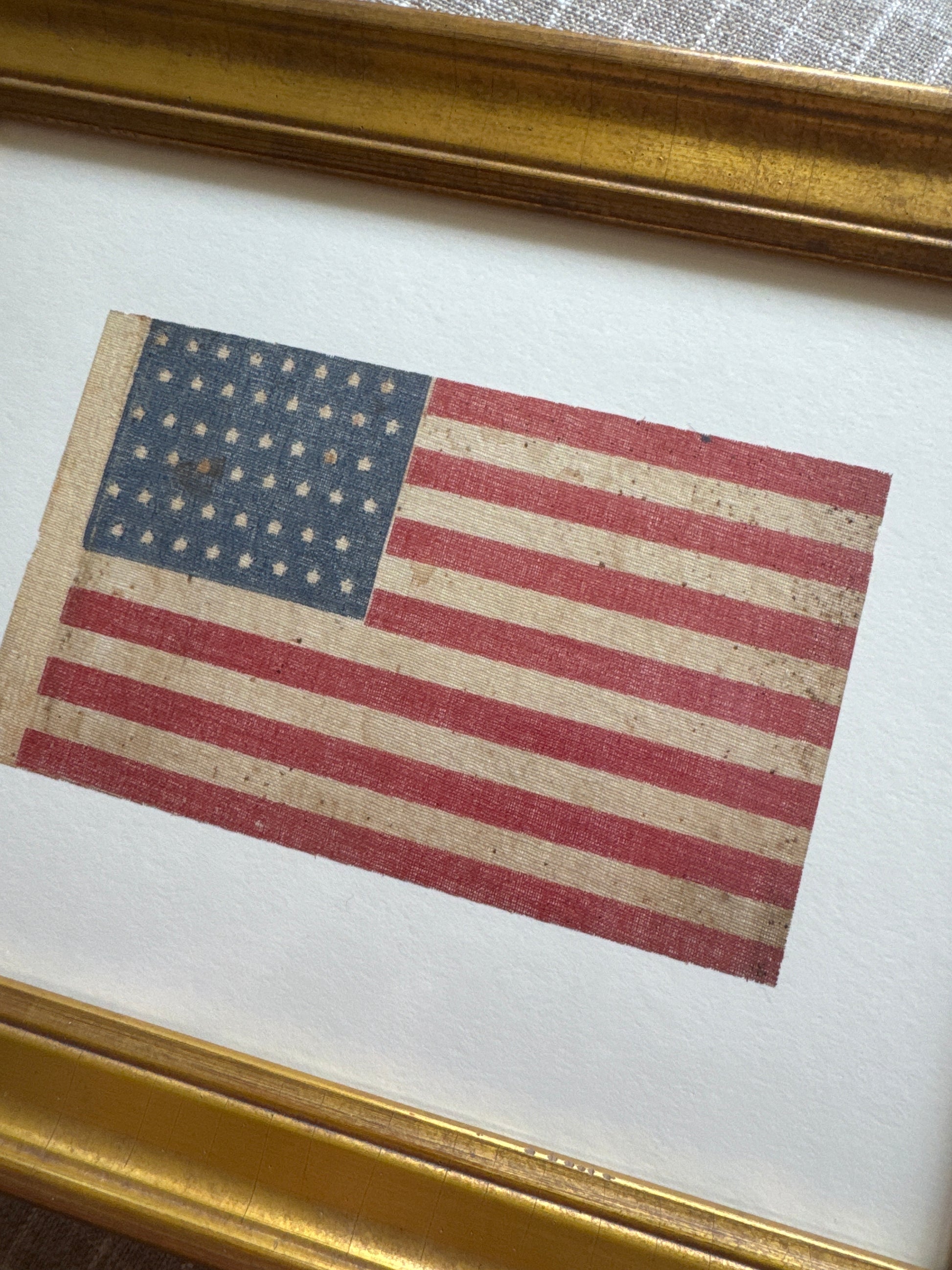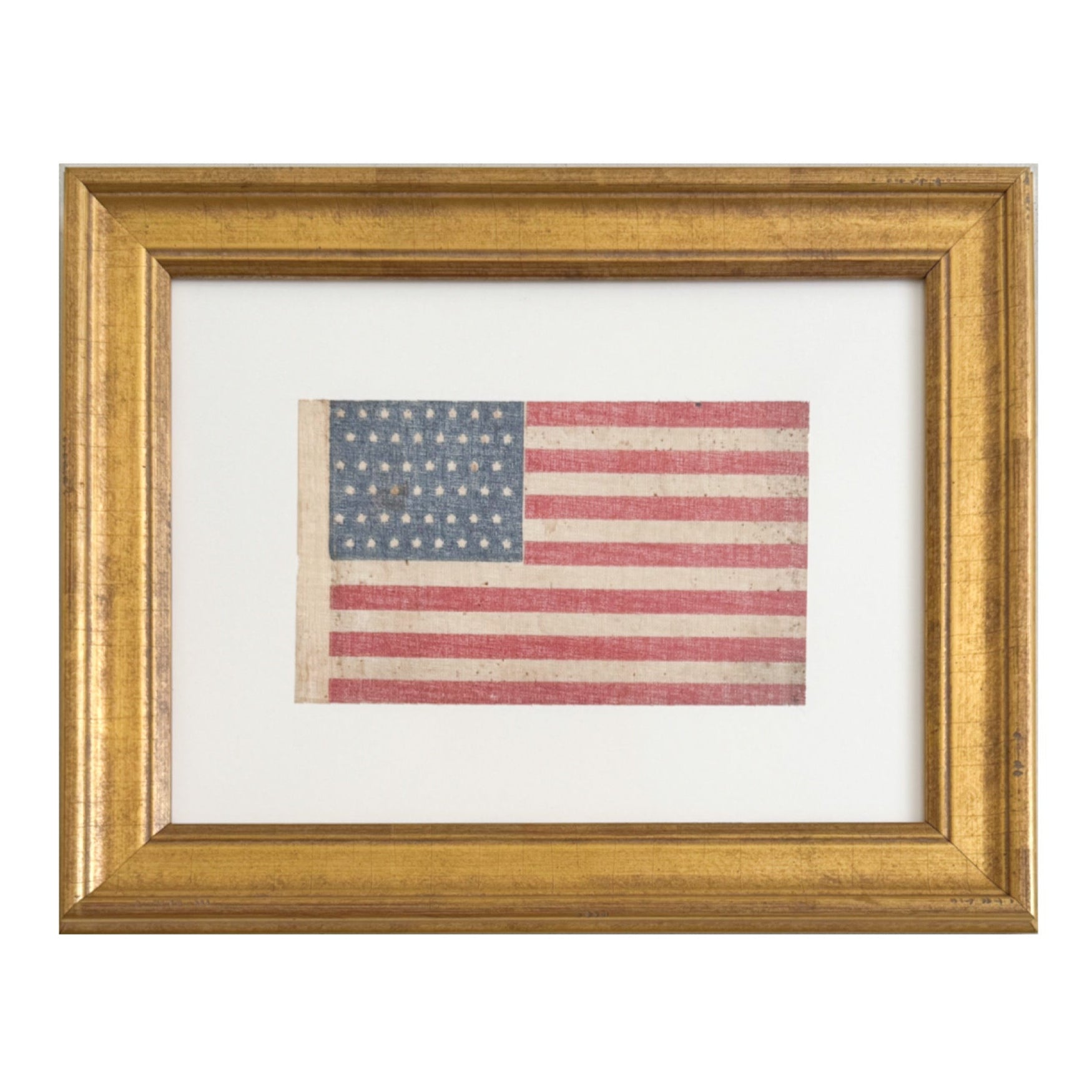 Measures 11 x 14 inches including the frame. An antique 48-star parade flag made of muslin. Lightly frayed and stained. Dates to the 1940s, likely presented on a wooden stick at the time of use. Preserved under UV protective, reduced glare glass with a classic gold frame.