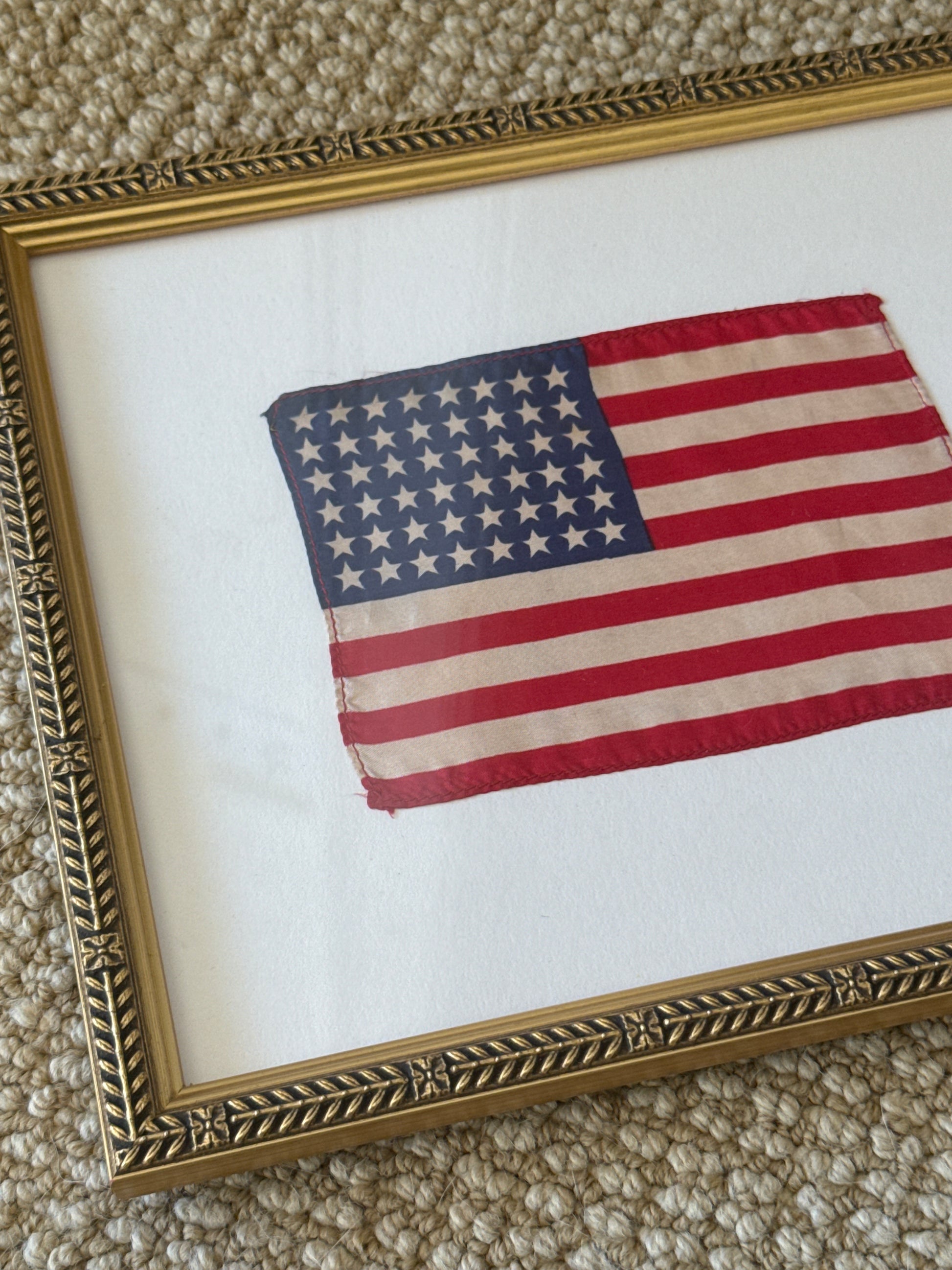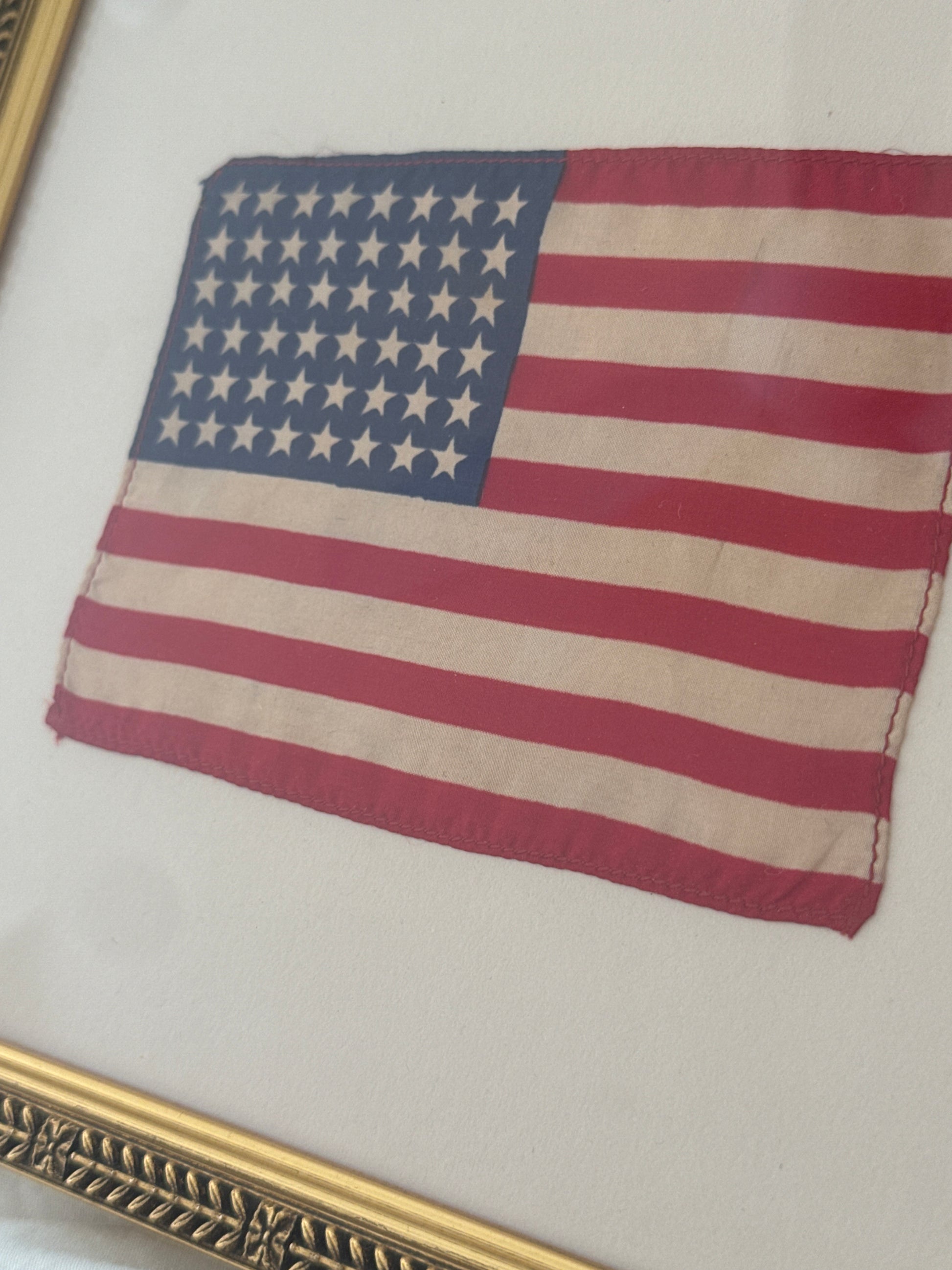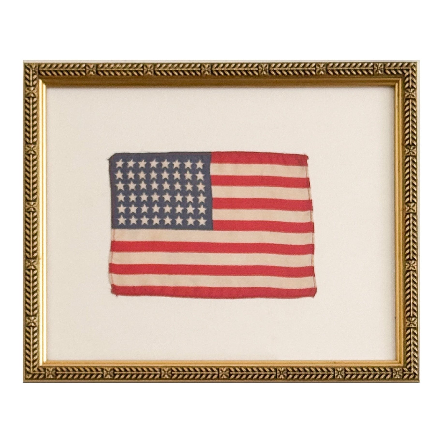An antique 48 star American flag made of silk. Good condition with light patina. Dates to the 1950s. Preserved under UV protective glass with acid-free matting. Measures 9 x 11 inches including the frame.