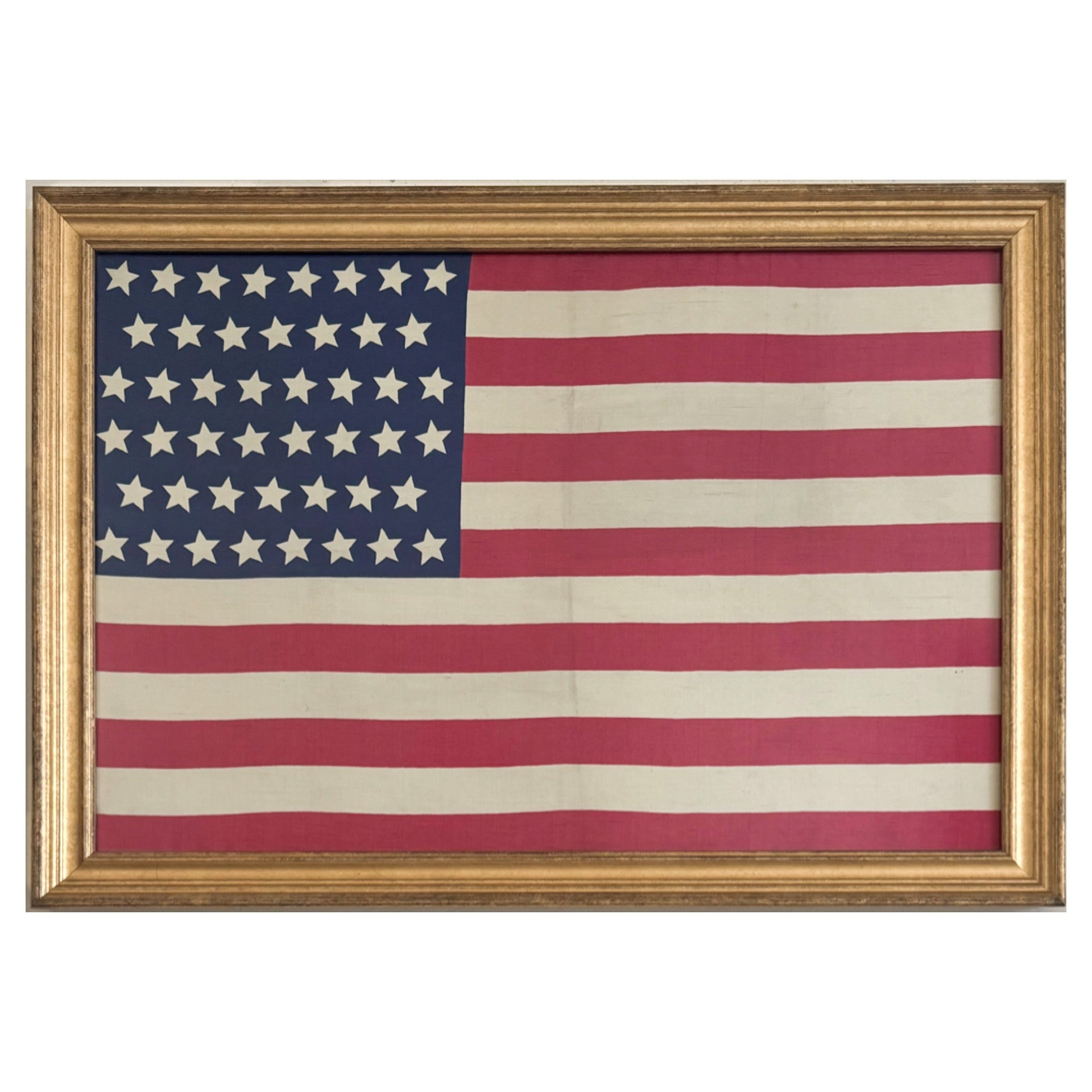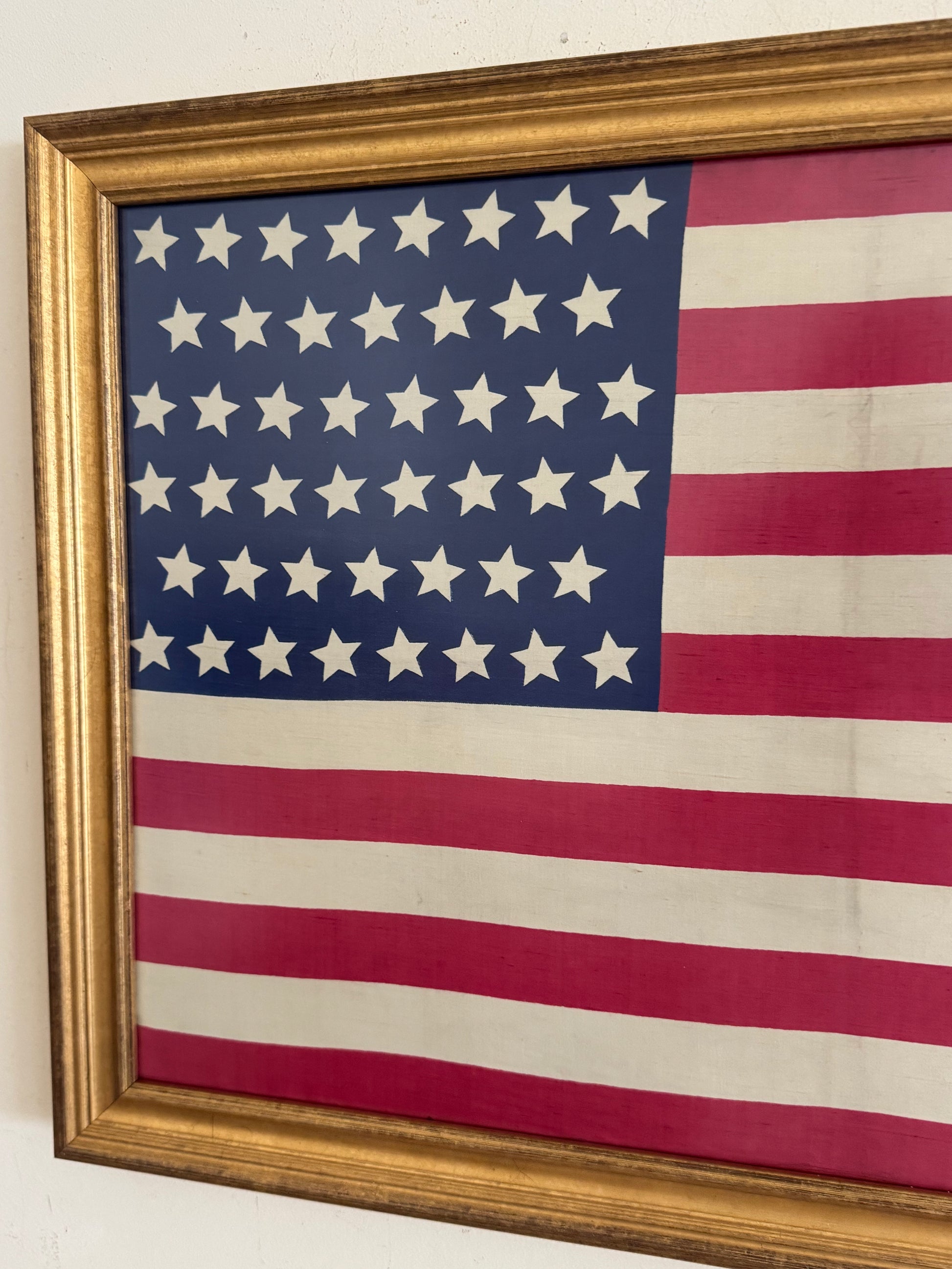 A antique 46 star flag made of silk. Dates to 1908. The 46-star United States flag became official on a July 4, 1908, following Oklahoma's admission as the 46th state on November 16, 1907. It remained the official flag for four years, until July 3, 1912, serving under Presidents Theodore Roosevelt and William H. Taft. Measures 17 x 25 inches including the frame.